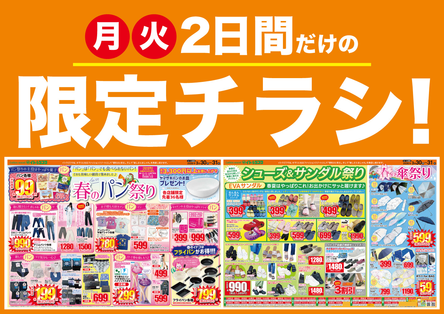 26/03/29 新着情報 ▼【表面】画像をクリックすると拡大します▼ ▼【裏面】画像をクリックすると拡大します▼ ... 25/07/17 新着情報 【イトゴお買い物サポート】 7月16日山陽新聞の朝刊にて、7月15日にイトウゴフク海吉店で第2回を開催した「イトゴお買い物サポート」を取り上げていただきました! 今回も特別養護老人ホーム錦海荘... 24/03/07 新着情報 イトゴファンの皆様に朗報です! イトゴ公式アプリに! ポイントを貯めれる &見れる&使える機能が追加!!! このポイント、イトゴ全店共通なので どこのお店に行っても使えます♪... 新着情報一覧をみる デジタルチラシ3月30日(月)~3月31日(火) 店舗一覧 店舗アルバイト・パートスタッフ募集 @itogofuku からのツイート